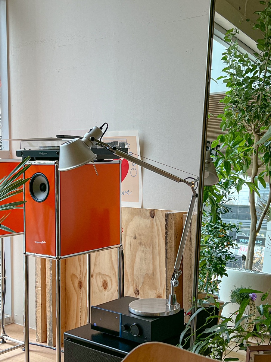 강렬한 주황빛의 스피커와 턴테이블